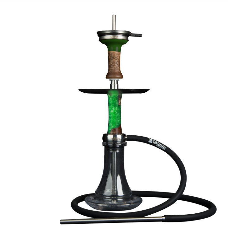 Contraband Hookah’s HITMAN Hookah is a mystical hookah that beautifully purges from the tray in all directions. This German hookah features a stainless steel stem and downstem and heart with a resin sleeve on top. It has a 360 degree tray purge that goes upwards from the tray. It also features a crystal glass base also comes complete with a glazed clay funnel bowl and chimney heat management system so no foil is required.